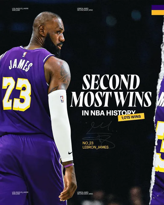 詹姆斯拿到常规赛生涯第1015场胜利,超越罗伯特-帕里什(1014场)升至历史第二,距离贾巴尔(1074场)还差59场。