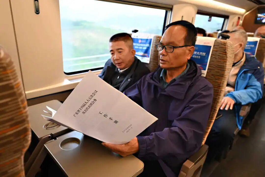省十四届人大五次会议将于1月26日上午在广州白云国际会议中心世纪大会堂正式开幕。1月24日上午,乘坐广湛高铁前往报到的茂名代表团省人大代表和列席人员,围绕锚定发展目标、聚焦民生热点等议题深入探讨,为广东在“十五五”时期开好局、起好步积极建言献策。