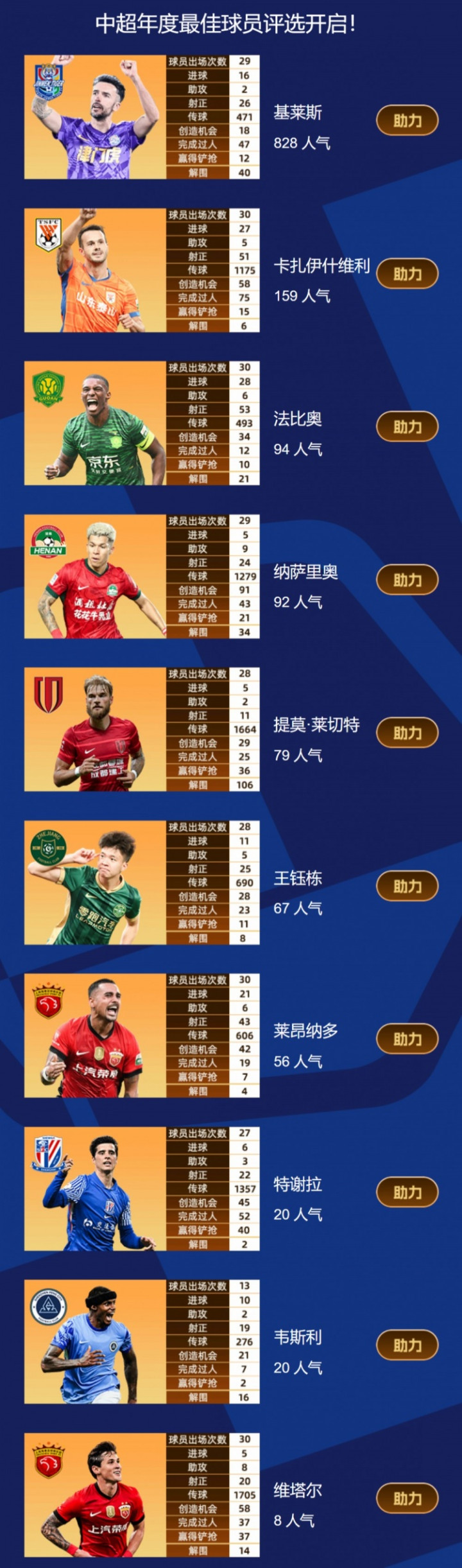 中超赛季最佳球员候选名单: