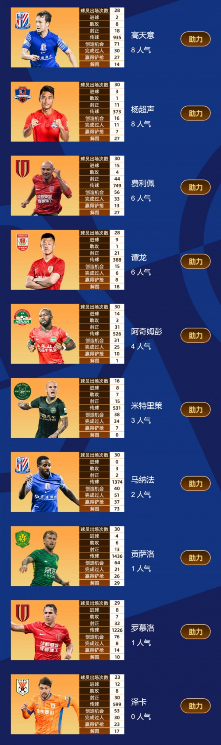 高天意(上海申花)28战2球8助攻